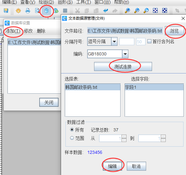 点击软件上方工具栏中的”数据库设置”按钮,弹出数据库设置对话框,点击添加“TXT文本数据源(文件)”,根据提示点击”浏览”选择要导入的TXT文本路径,点击浏览-测试链接-添加-关闭。
