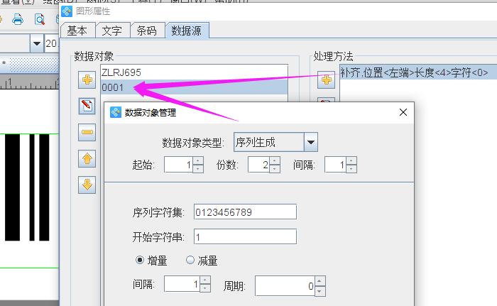 然后再数据源窗口再次点击左侧“+”,使用“序列生成”来添加顺序递增的数据,由于是需要同一个数据打印两份,所以可在此窗口将份数设置为2,然后点击右侧“补齐”的处理方法填充字符: