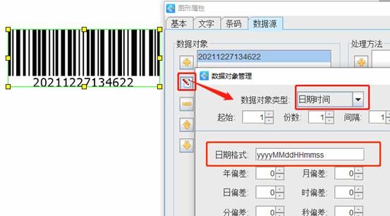 双击条形码打开条形码的“图形属性”-“数据源”修改条码数据,点击左侧数据对象下面的第二个“修改”按钮,弹出数据对象管理窗口,把数据对象类型修改为“日期时间”,可以看到日期格式的默认设置是“yyyy-MM-dd HH:mm:ss”,这种格式得出来的数据不是纯数字,年月日时分秒之间都有相应的符号,只需要把日期格式修改为“yyyyMMddHHmmss”即可,得到的就是有年月日时分秒生成的纯数字数据。