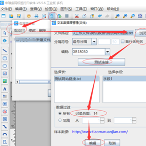 打开二维码生成器,点击新建标签,在“文档设置”中根据打印机中实际标签纸张大小去进行设置。接着通过软件上方“数据库设置”,添加- 选择TXT文本数据源(文件);在打开的数据源管理窗口中,点击“浏览”,选择需要导入的TXT文本,点击“测试连接”(检查核对下面的记录总数、样本数据和TXT文本中的是否一致),然后点击“添加”即可。