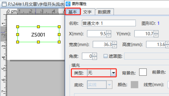 2. 选中标签中的文本对象,双击打开其图形属性窗口,在“基本”选项卡中我们可以看到文本的“填充背景色”属性默认是无,也就是文本框中不填充任何背景颜色,是透明的。