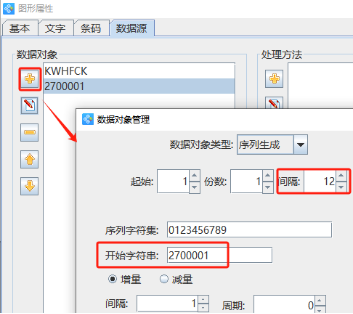 点击数据对象下面的“添加”按钮,添加一个“序列生成”类型的数据,开始字符串设置为“2700001”,数据对象类型下面的“间隔”设置为12,那么下一个标签相同位置就会生成270001327000025……流水号