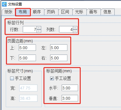 打开中琅可变数据排版软件,根据实际纸张设置纸张尺寸和布局,这里纸张我们设置为A4纸,标签行列数设置为7行4列,纸张上下左右页面边距(上下左右非打印区域距离)都设置为5mm,标签的水平间距和垂直间距都设置为3mm。