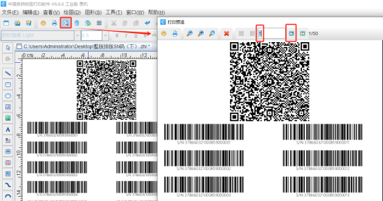 5. 设置完成之后,点击软件顶部的“打印预览”按钮,翻页查看批量生成的SN码标签,预览无误就可以直接连接打印机打印或者是批量输出PDF文档了。